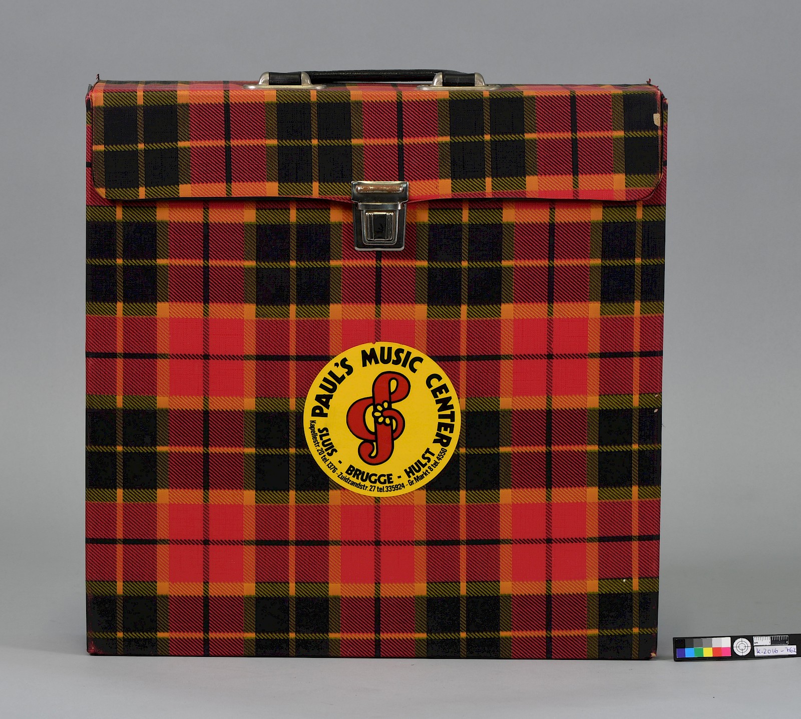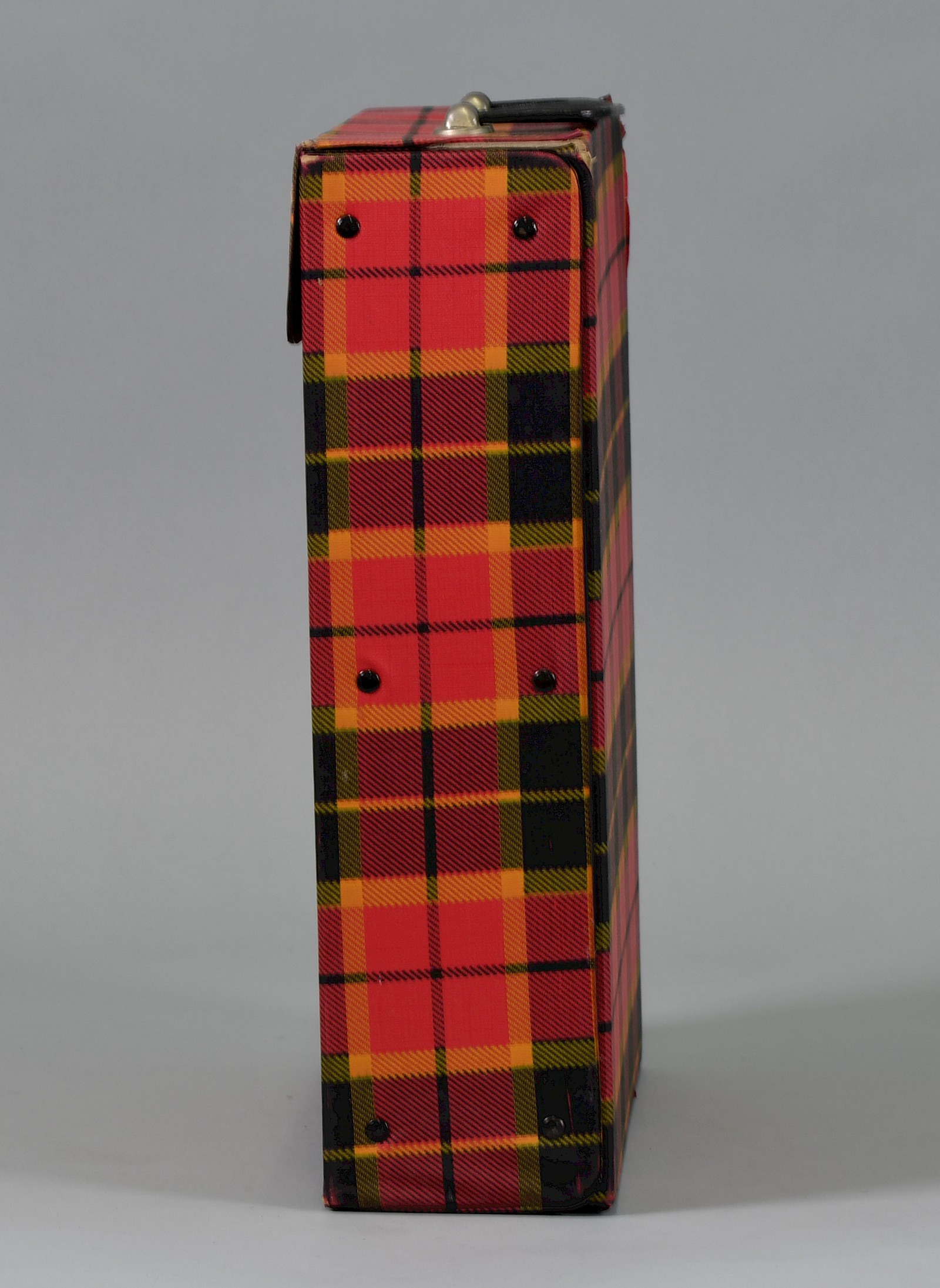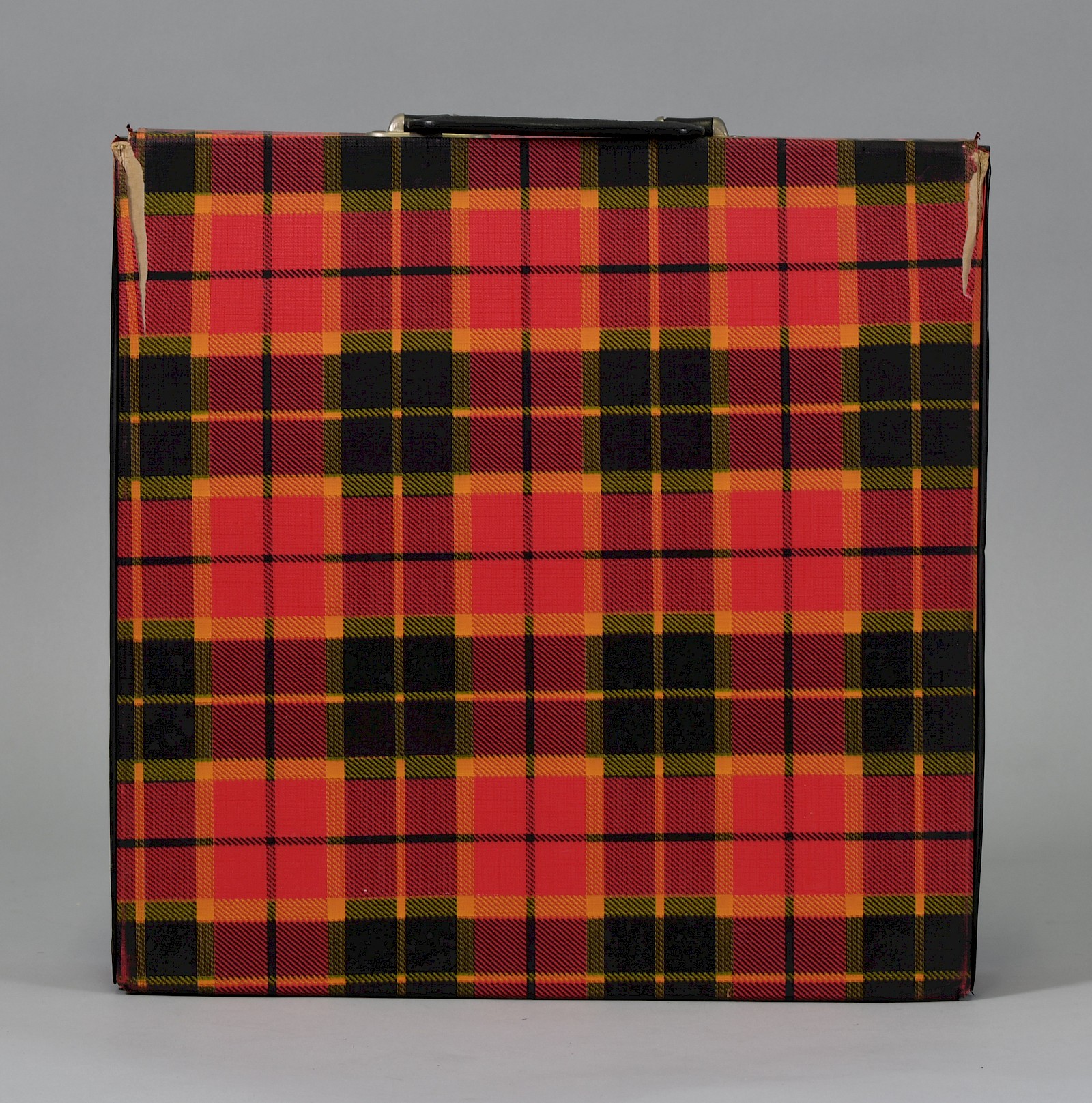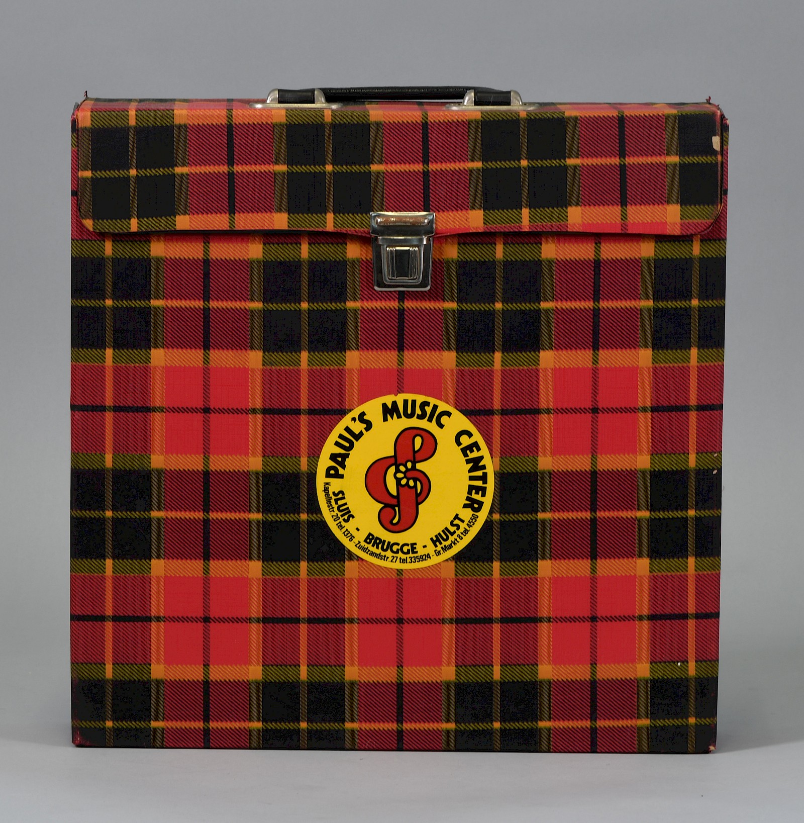 Koffer aus Pappe mit Überzug aus PVC-Folie,Überschlagklappe für Langspielplatten, Schottenmuster; Erhalten mit 14 Langspielplatten „Sinterklaas-Musik“ in Koffer