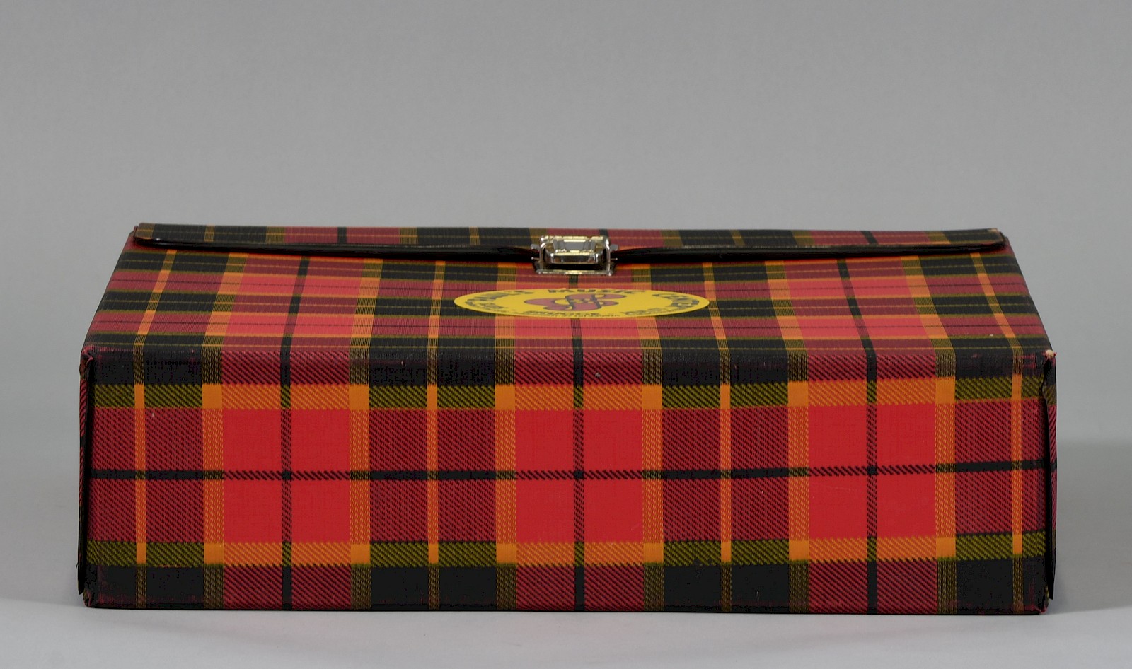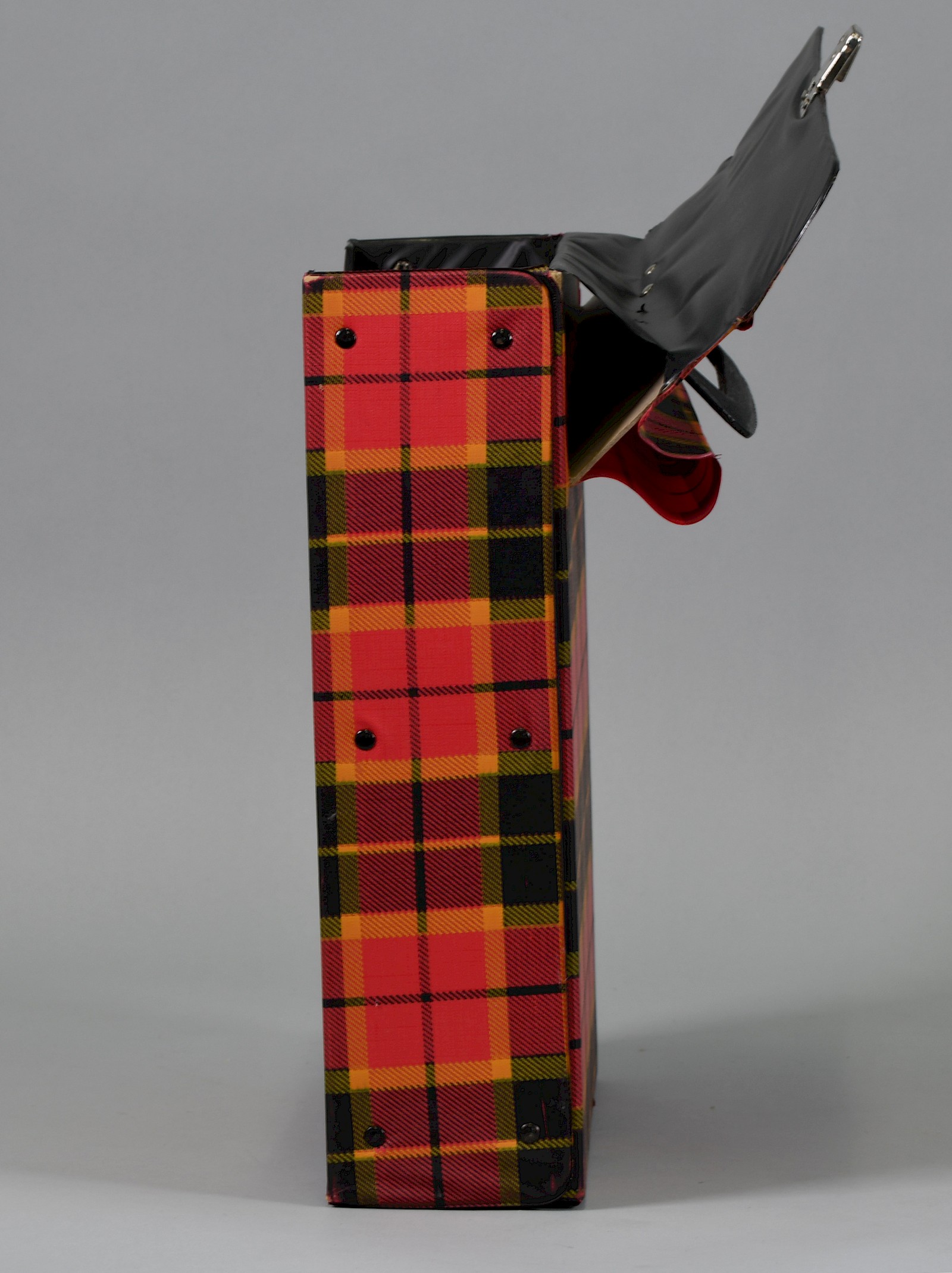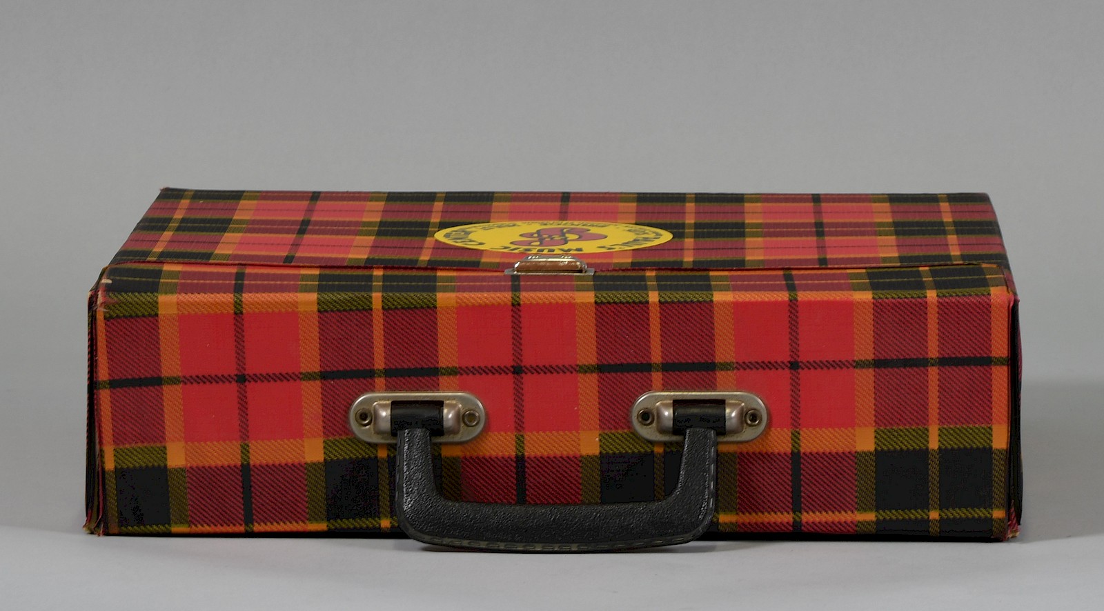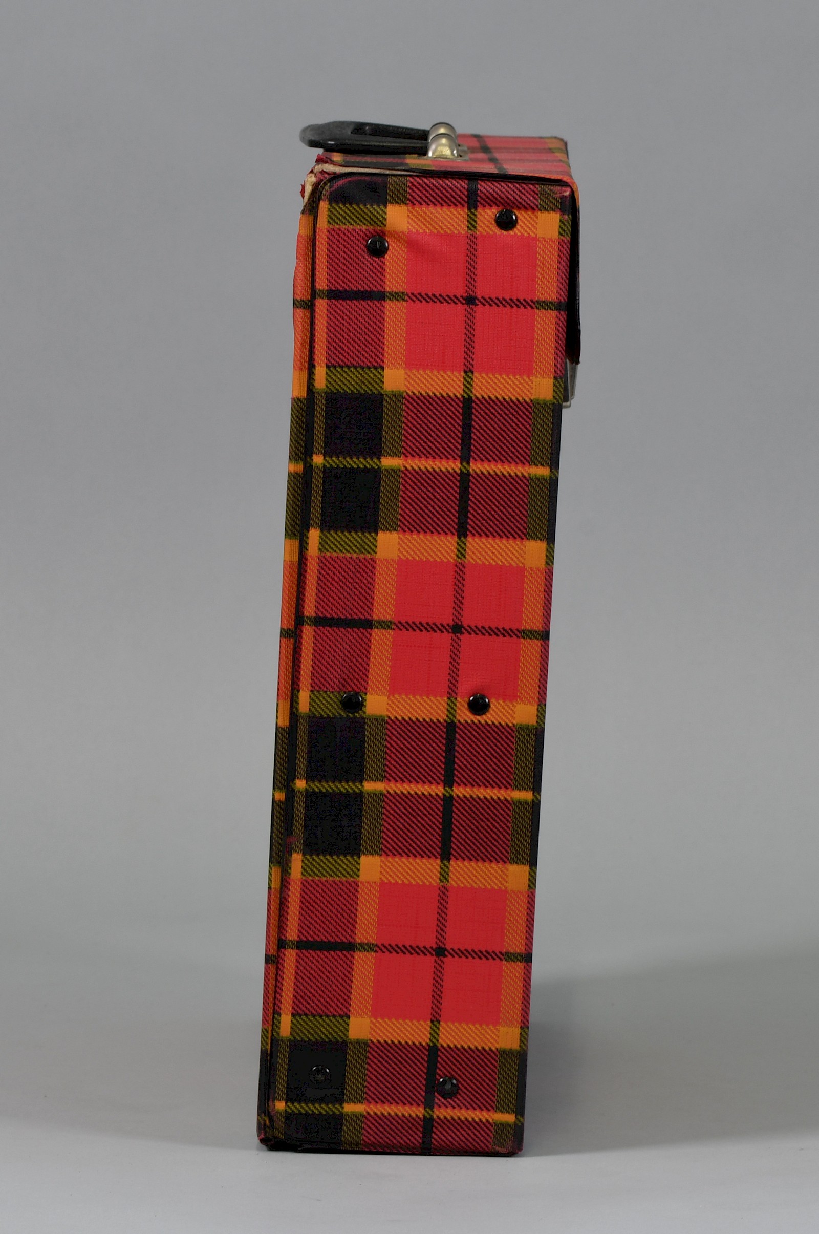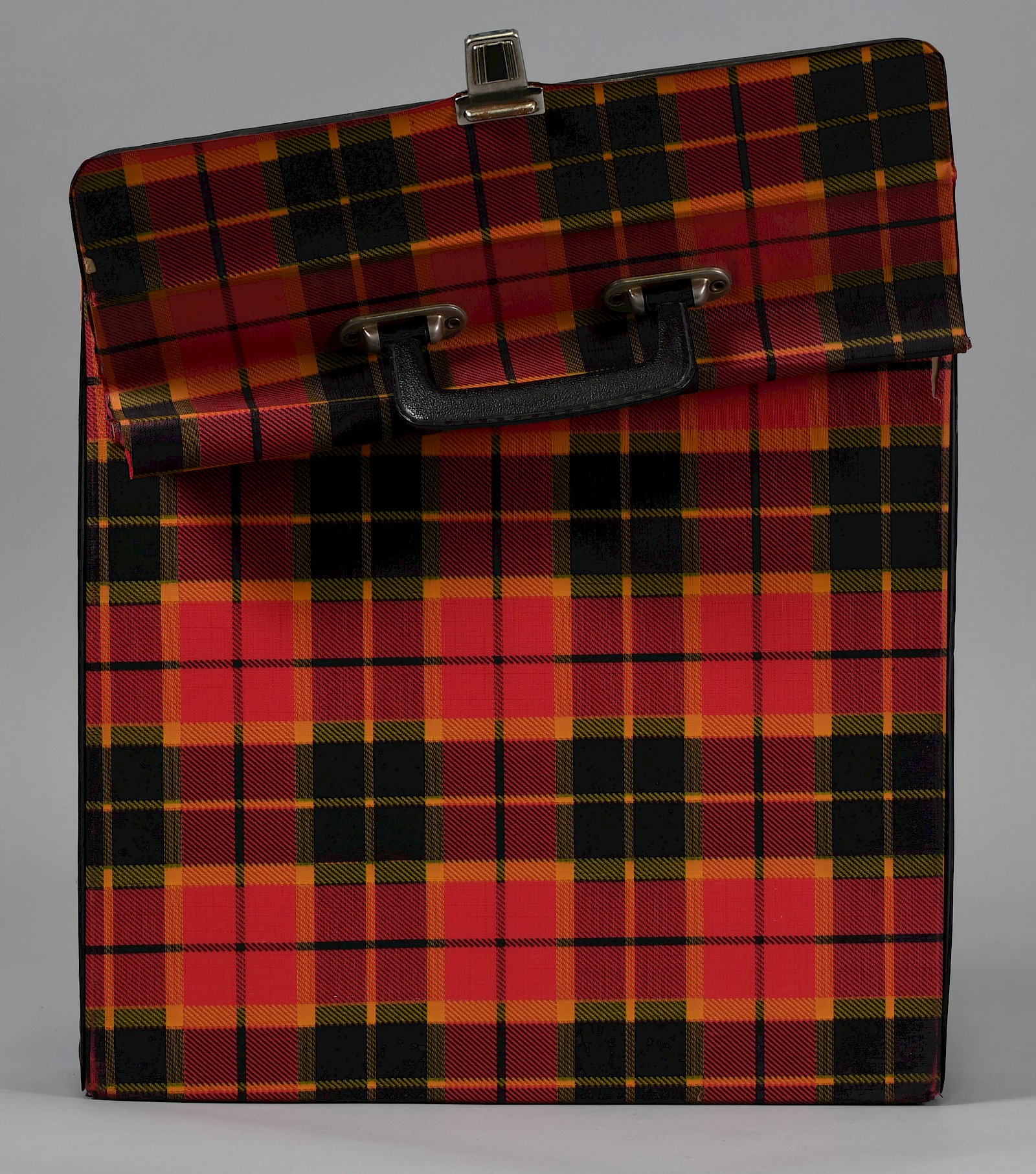 Koffer aus Pappe mit Überzug aus PVC-Folie,Überschlagklappe für Langspielplatten, Schottenmuster; Erhalten mit 14 Langspielplatten „Sinterklaas-Musik“ in Koffer